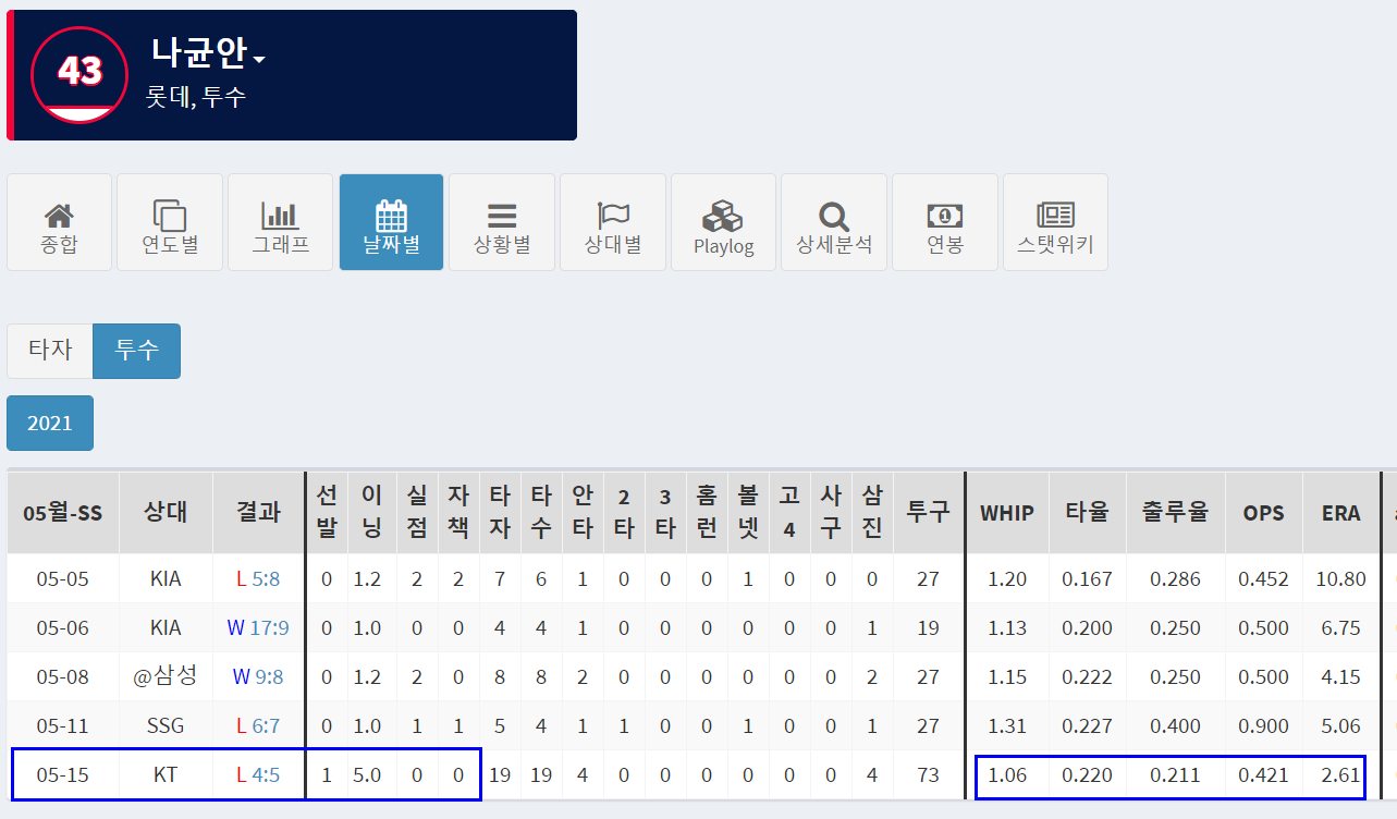 표본이 적어 쉽게 나균안의 호투를 예상하기 어렵지만 10일만의 등판이라는 점은 호재다. 두팀 모두 하향곡선을 그리며 추락하고 있기때문에 서로 조금만 잘던져도 호투할 가능성이 크거나, 조금만 못던져도 크게 난타당할 가능성이 크다. 백신 접종 및 주말을 포함하여 2일의 휴일을 부여받았기때문에 투타 밸런스가 조율되어 분위기가 쇄신되었을 가능성도 있다. 나균안의 선발 데뷔전 역전패당한것처럼 롯데 불펜상황도 매우 좋지 못하기때문에 양팀의 승리를 가늠하기 힘들다. 그래도 굳이 꼽아야 한다면 롯데승을 조심스레 골라보겠다. 누가누가 더 못하나 지켜보는 재미가있는 경기다. 베팅은 추천하지 않는다.