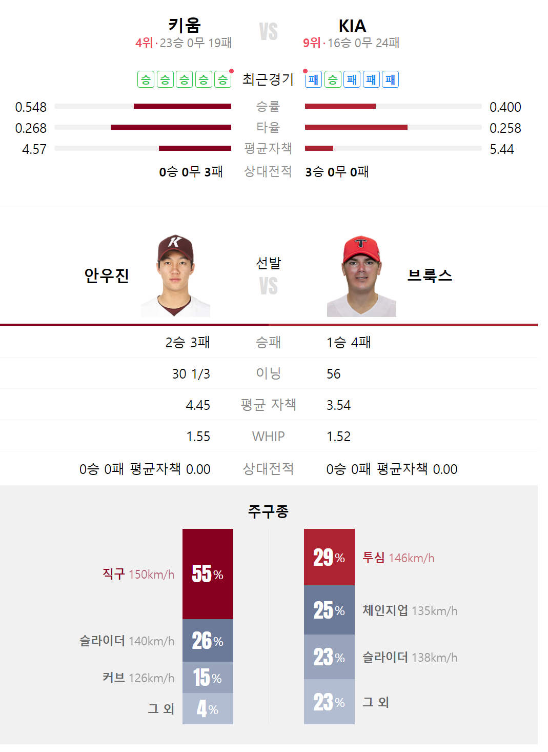 안우진과 브룩스의 대결. 선발무게감만 따진다면 브룩스가 몇수위지만 양팀 타선의 분위기를 합친다면 오히려 키움쪽이 더 좋아보일정도다. 안우진 또한 시즌초의 부진을 딛고 이제 선발투수로 자리잡아가는 중.
