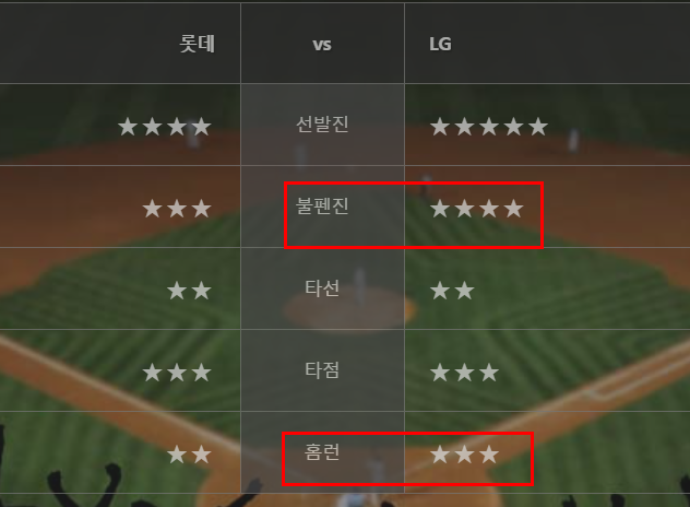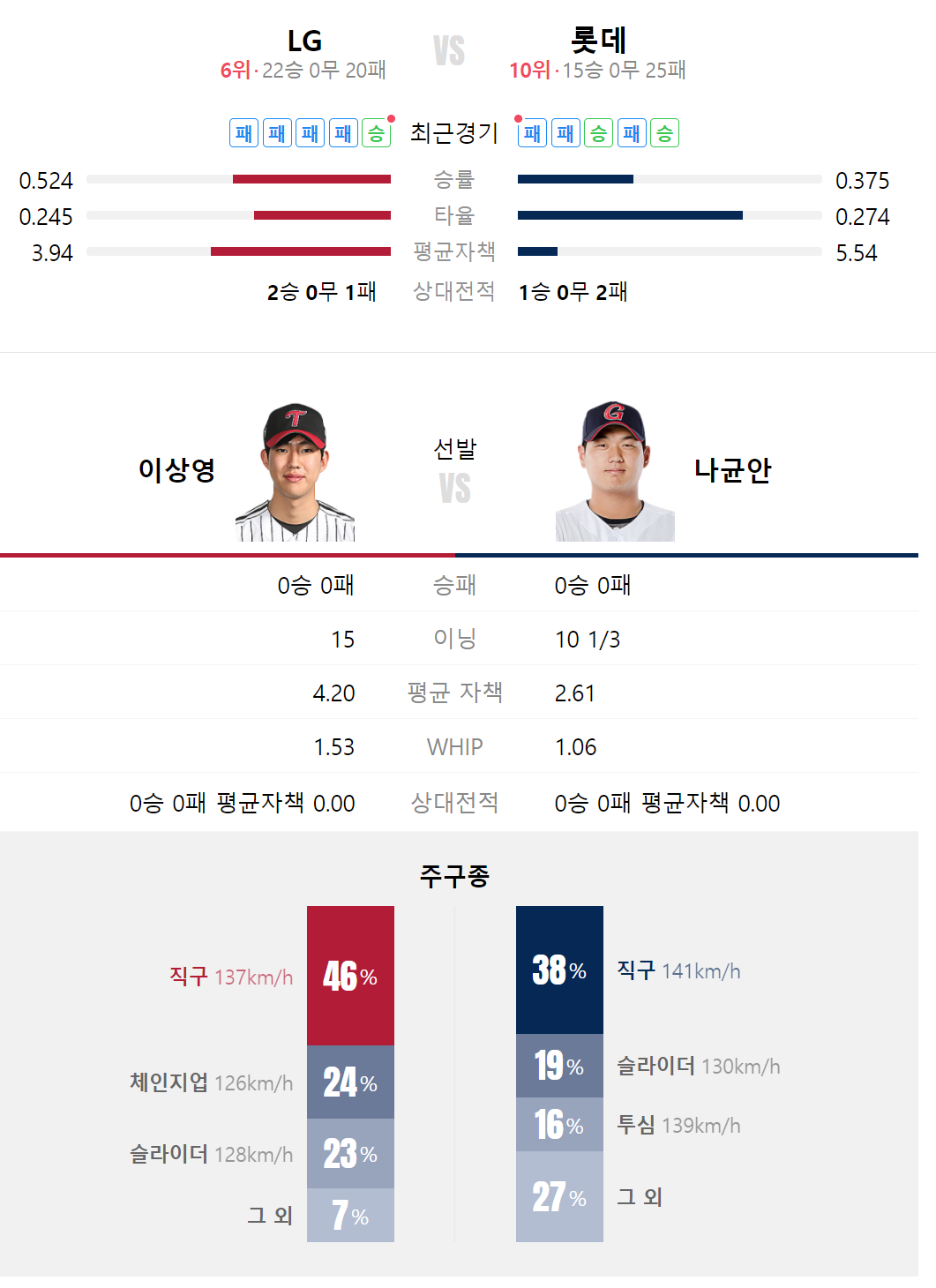 이상영과 나균안의 대결. 둘다 신인급투수로 아직 안정감을 논하기엔 이르다. 나균안은 포수에서 투수로 전환한뒤 지난 첫 선발등판에서 5이닝 무실점을 하며 제구력이 뒷받침되는 놀라운 호투를 펼쳤으나 불펜진이 멋지게 날려 축포를 쏘았다. 엘지의 최근 타선이 또다시 식물로 변질되어가고 있고 유독 신인에게 약했던 모습을 되살린다면 롯데에게 승산이 충분히 있어보이기도 한다.