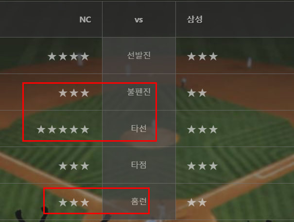 백정현과 신민혁의 대결. 기세 좋았던 백정현은 역시 느린구속의 한계에 부딪치며 최근 실점이 많아지고있다. 반면 신민혁은 원태인을 넘어서는 체인지업 피안타율 1위라는 최고의 구종으로 연일 호투행진이다. 양팀 타선도 약하지 않기에 신민혁쪽의 우세가 있으나, 양팀 필승조의 무게감은 삼성쪽으로 기울기때문에 삼성이 얼마나 점수를 뽑느냐가 관건으로 보인다.