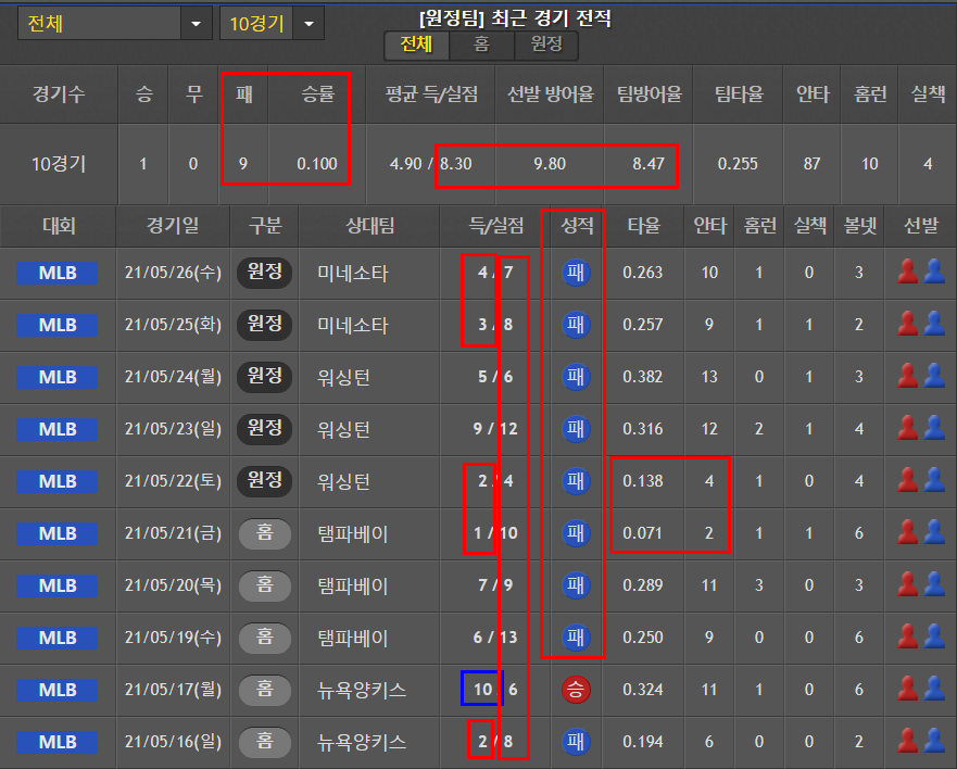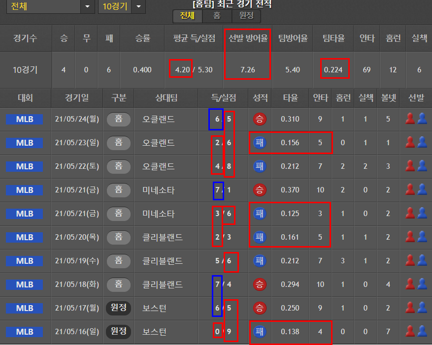 에인절스는 5점이상의 실점이 너무 많다. 특히 10경기 평균 선발진의 7.26 활약이 패배의 원흉으로 보인다.