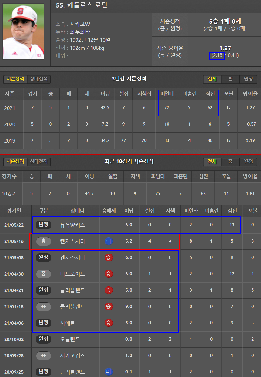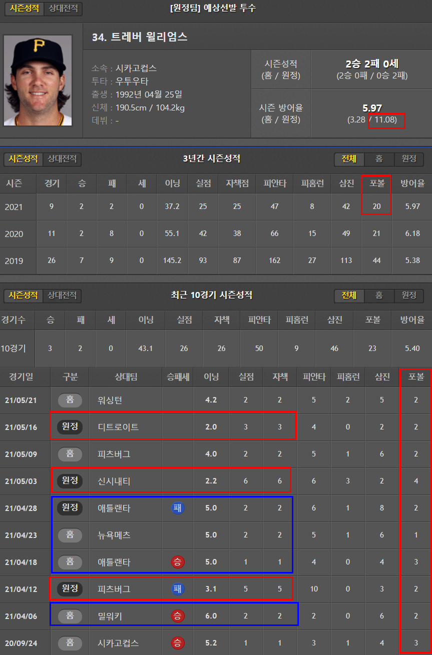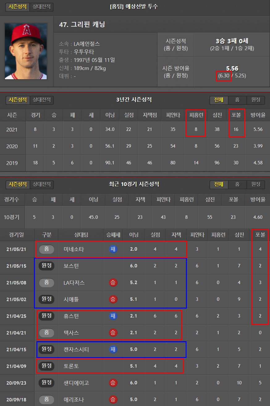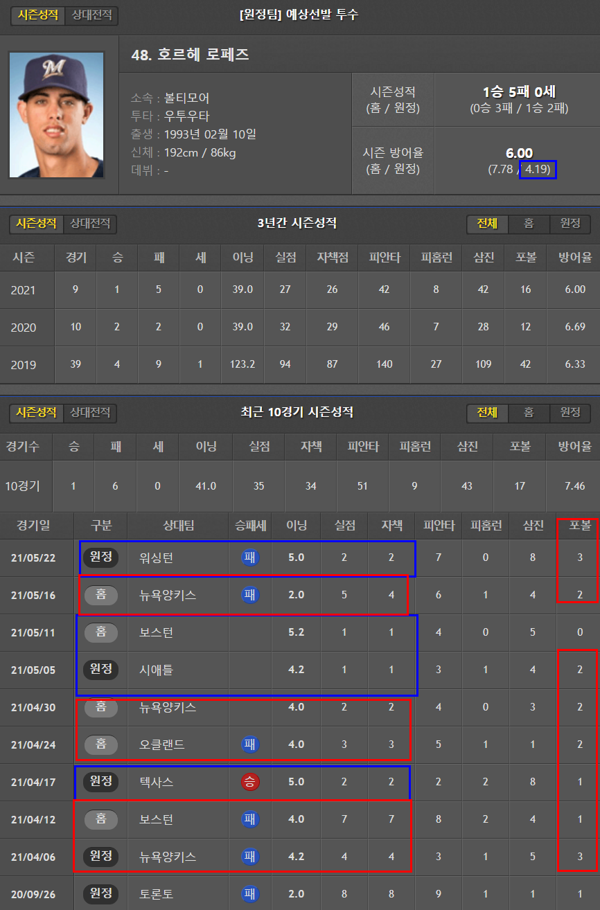 원정이 4.19로 좀 더 낫다. 운좋은날 5이닝을 겨우 소화하고 있는 실정. 꼬리표처럼 따라다니는 볼넷 문제. 볼티모어의 투수인만큼 안정감을 느끼기 어려워보인다.