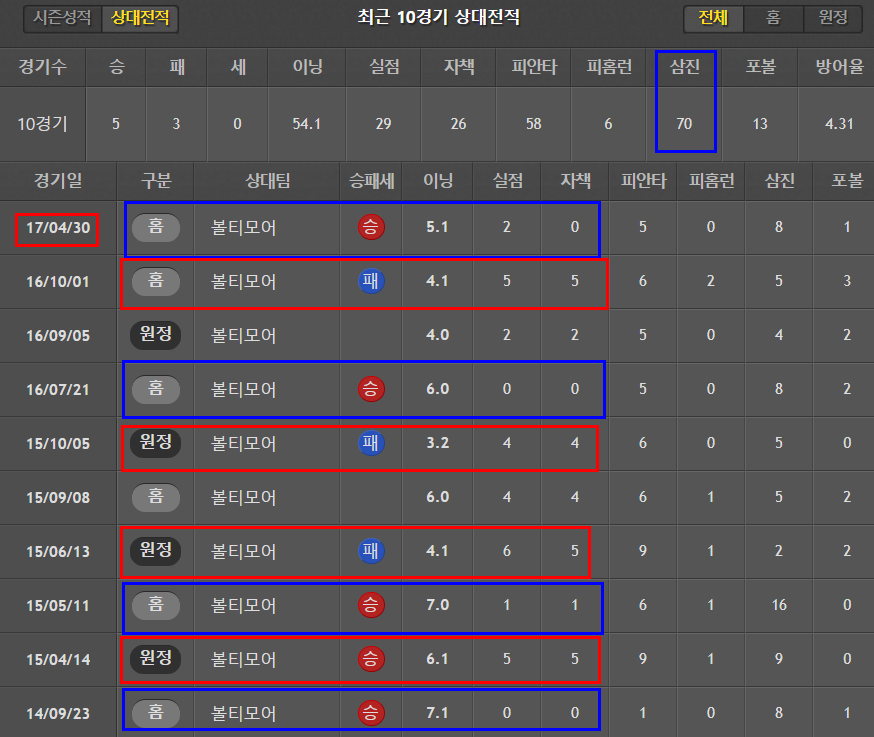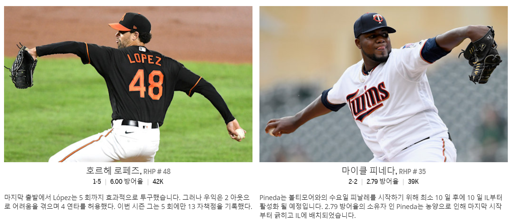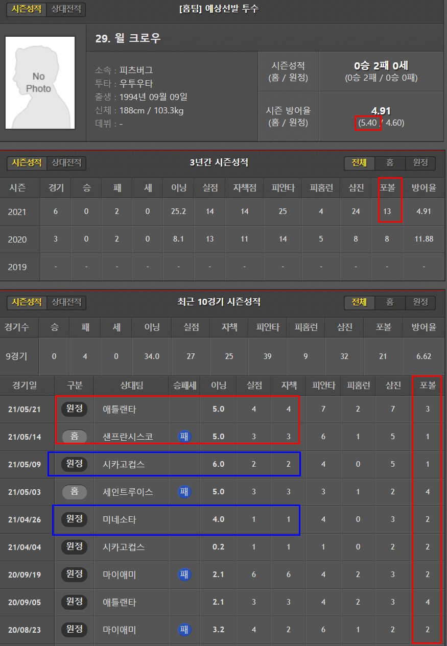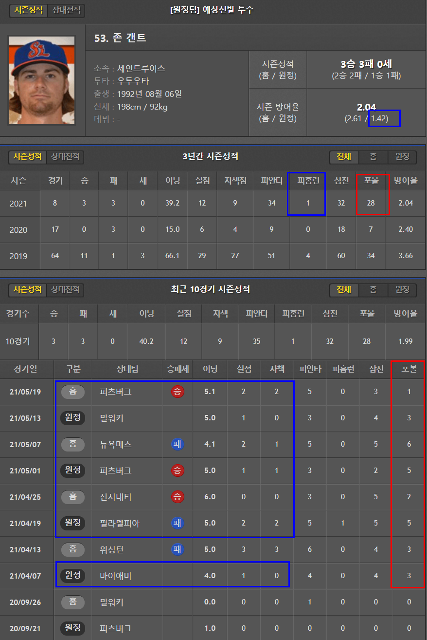 원정이 4.19로 좀 더 낫다. 운좋은날 5이닝을 겨우 소화하고 있는 실정. 꼬리표처럼 따라다니는 볼넷 문제. 볼티모어의 투수인만큼 안정감을 느끼기 어려워보인다.