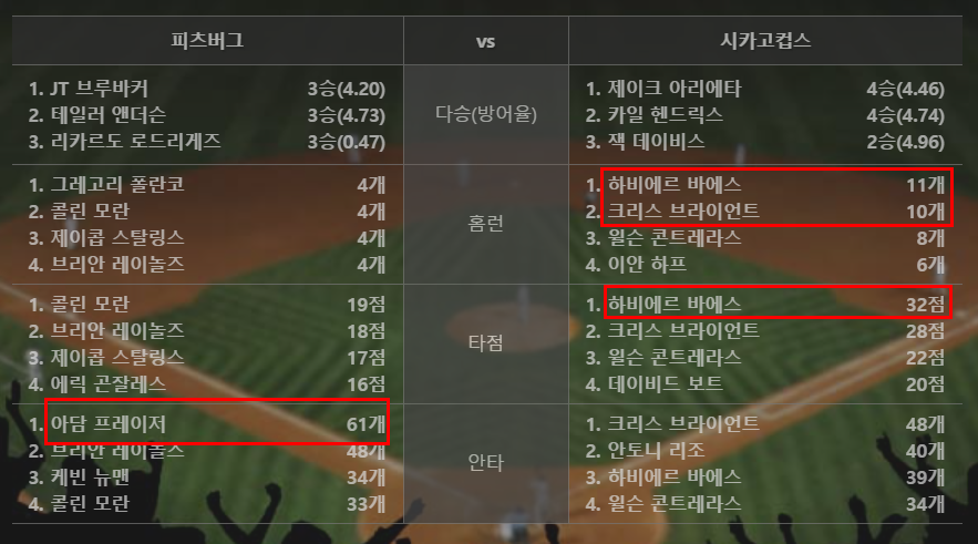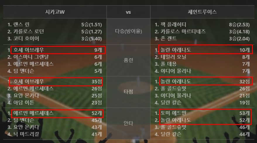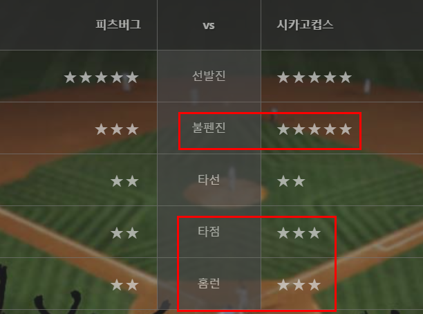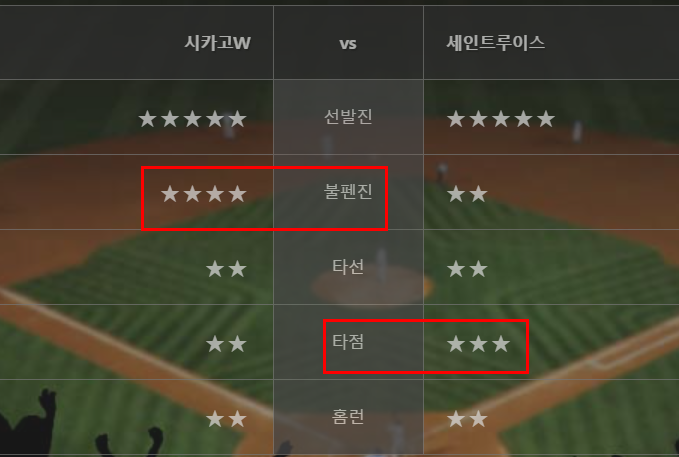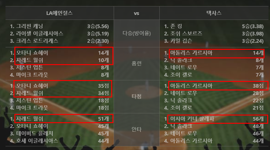 반면 텍사스 선발진의 평자는 3.76으로 안정되있다. 다만 팀타율이 .217로 바닥을 기고있는데 이는 양키스 시리즈에서 클루버에게 노히트게임을 내주며 크게 부진했기때문으로 보인다.