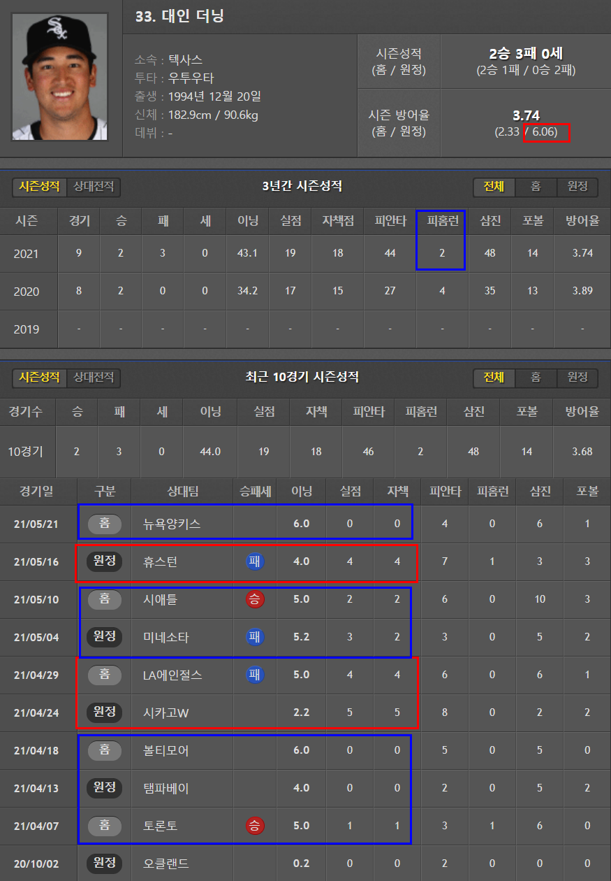 통조림군에 비해 더닝은 상황이 좀 양호한편이다. 최근 흔들리고 있긴하지만 어쨋든 5이닝을 사수하려는 노력이 돋보인다. 다만 원정 6.06평자는 다소 불안해보인다. 공교롭게도 홈에서 털린 4월 29일 경기가 에인절스와의 맞대결이였다.