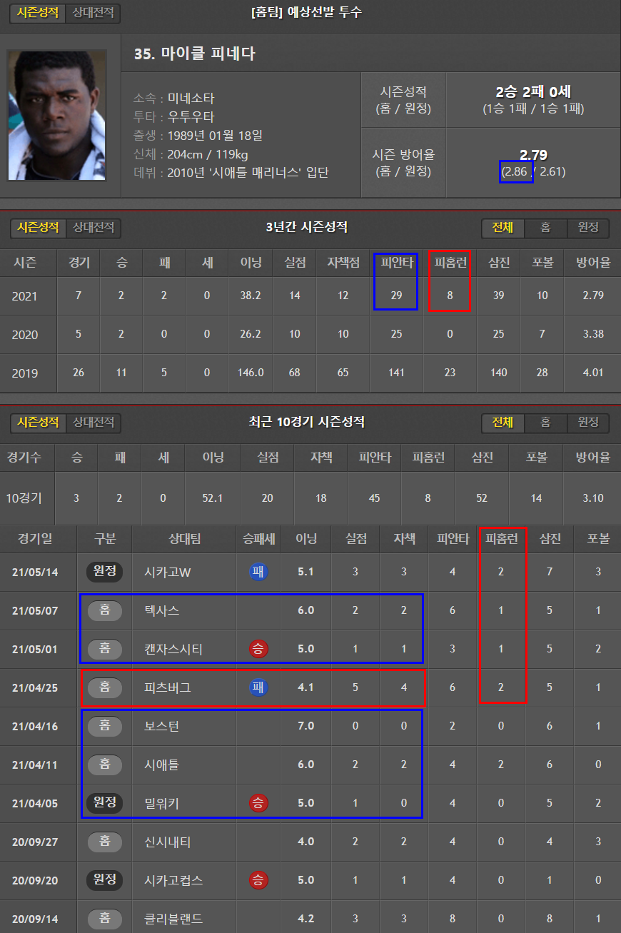 피안타율도 낮고 다 좋지만, 최근 피홈런으로 실점하는 경우가 많다. 이닝 소화능력은 5이닝정도 기대할수있다.