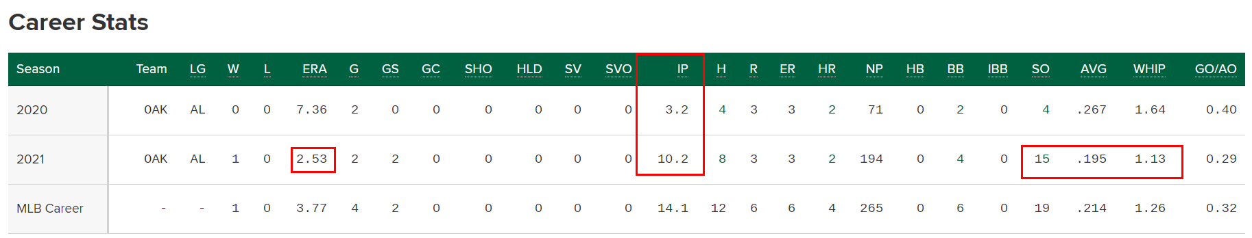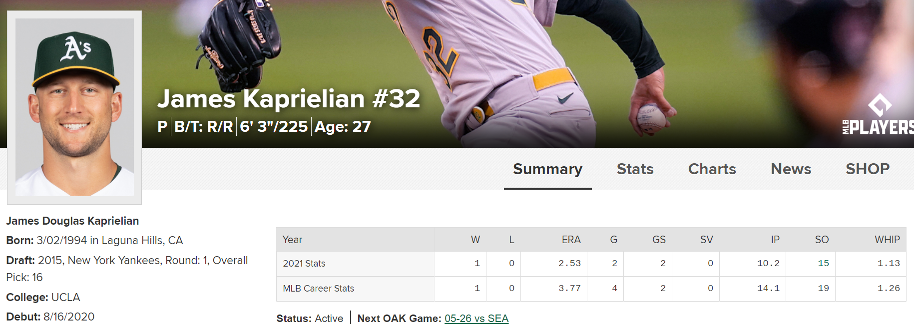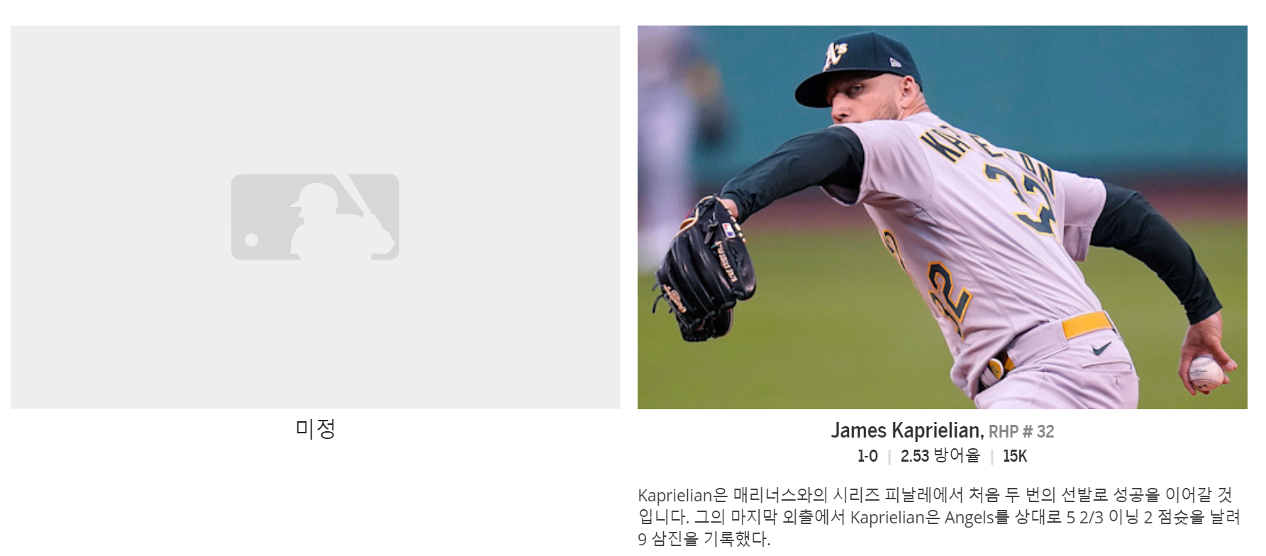 오클랜드 신인이다. 기록이 부족하다. 작년과 올해 합쳐 4경기등판했고, 올해 2경기는 선발로 나왔고 아직까지 훌륭한 피칭을 선보이고있다.