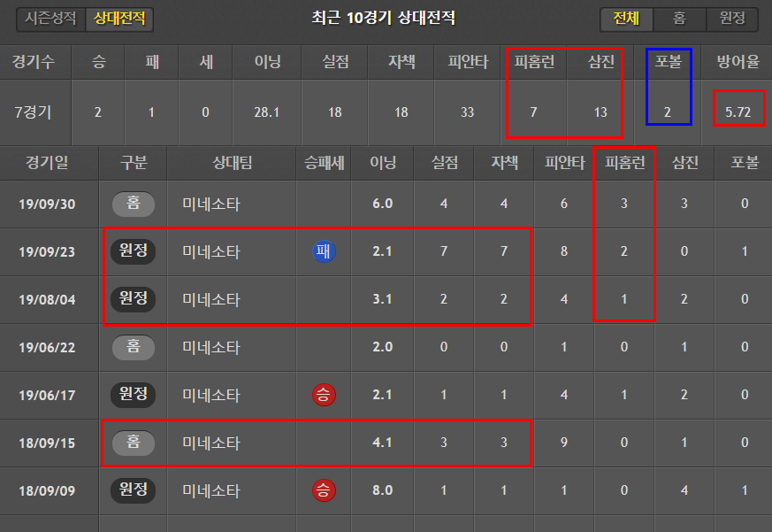 미네소타와의 맞대결 전적도 신통치않다.