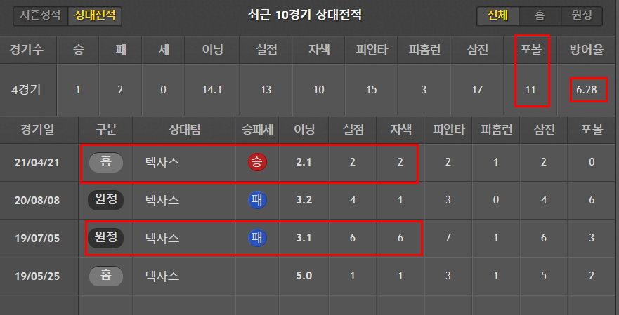 역대 텍사스 전 기록이 좋지않다. 특히 14.1이닝 11볼넷은...