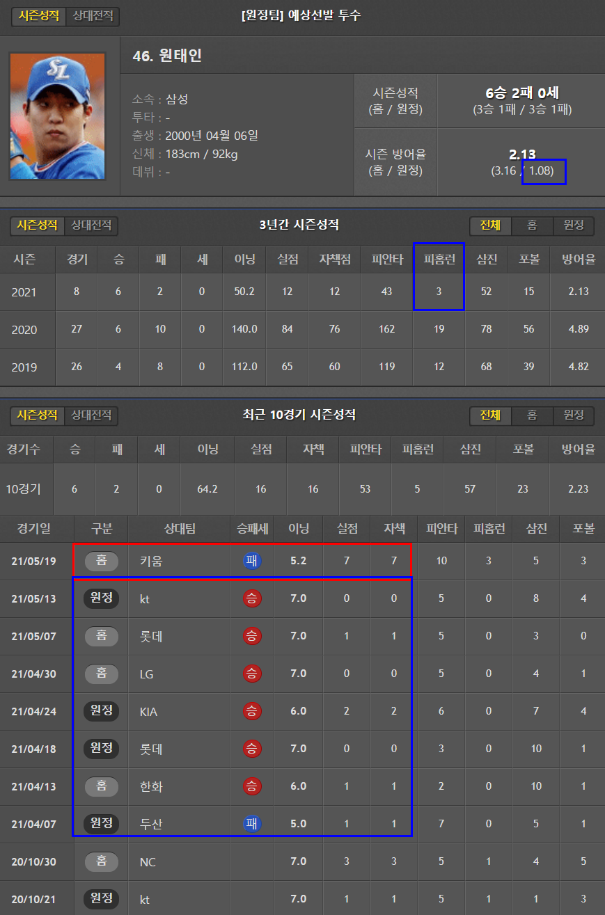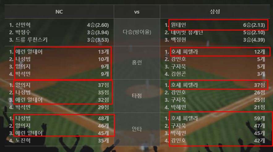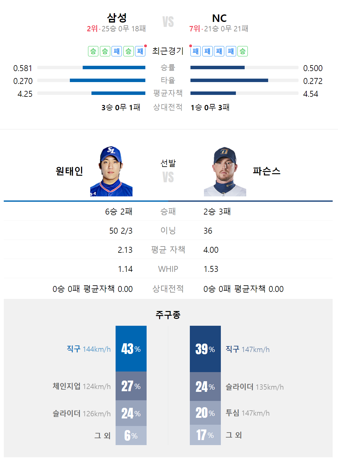 원태인과 파슨스의 대결. 박동원에게 3연타석 홈런을 허용하며 7실점으로 무너지면서 1.00이였던 평자가 2.13으로 두배로 뛰었다. 이번 등판을 통해서 다시 1점대로 끌어내릴 피칭을 기대해본다. 반면, 파슨스 잠시 흔들렸으나 다시 안정을 찾아가고 있다. 다만, 직전경기 백정현과 삼성의 추격조 불펜으로부터 1점밖에 뽑아내지 못한 점은 파슨스에게 부담으로 작용할 것이다.