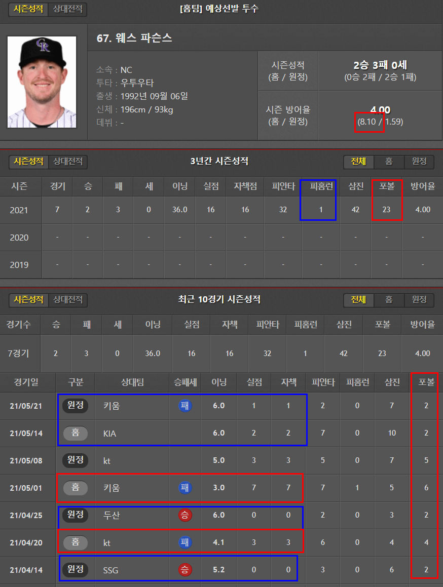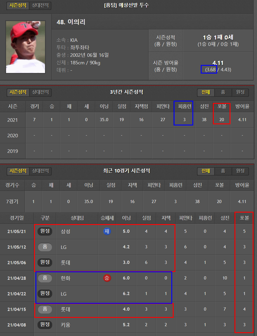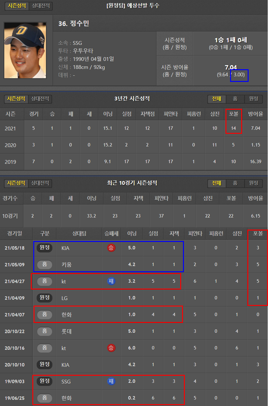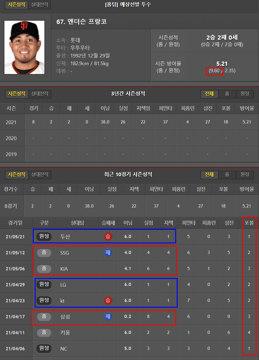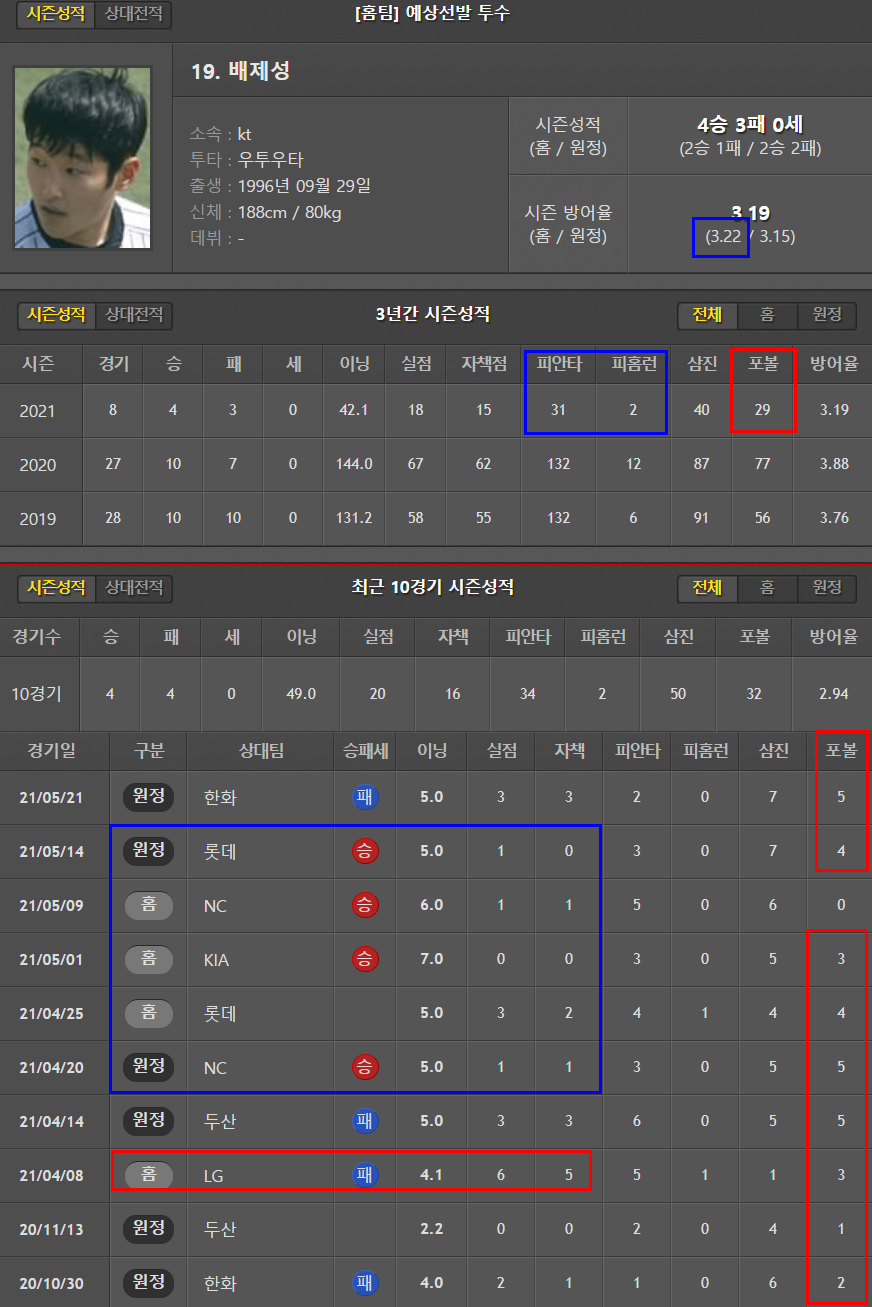 홈 8.1평자로 유독 홈 성적이 좋지 못하다. 공이 좋은데 반해 무사사구 경기가 없는 만큼 볼넷을 줄이는게 관건이다.