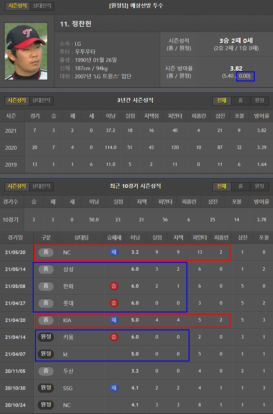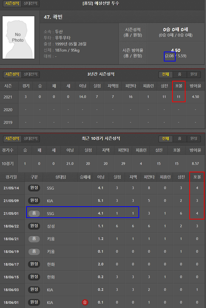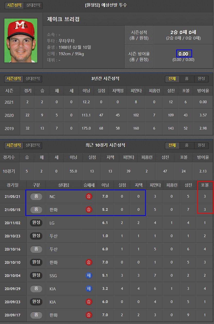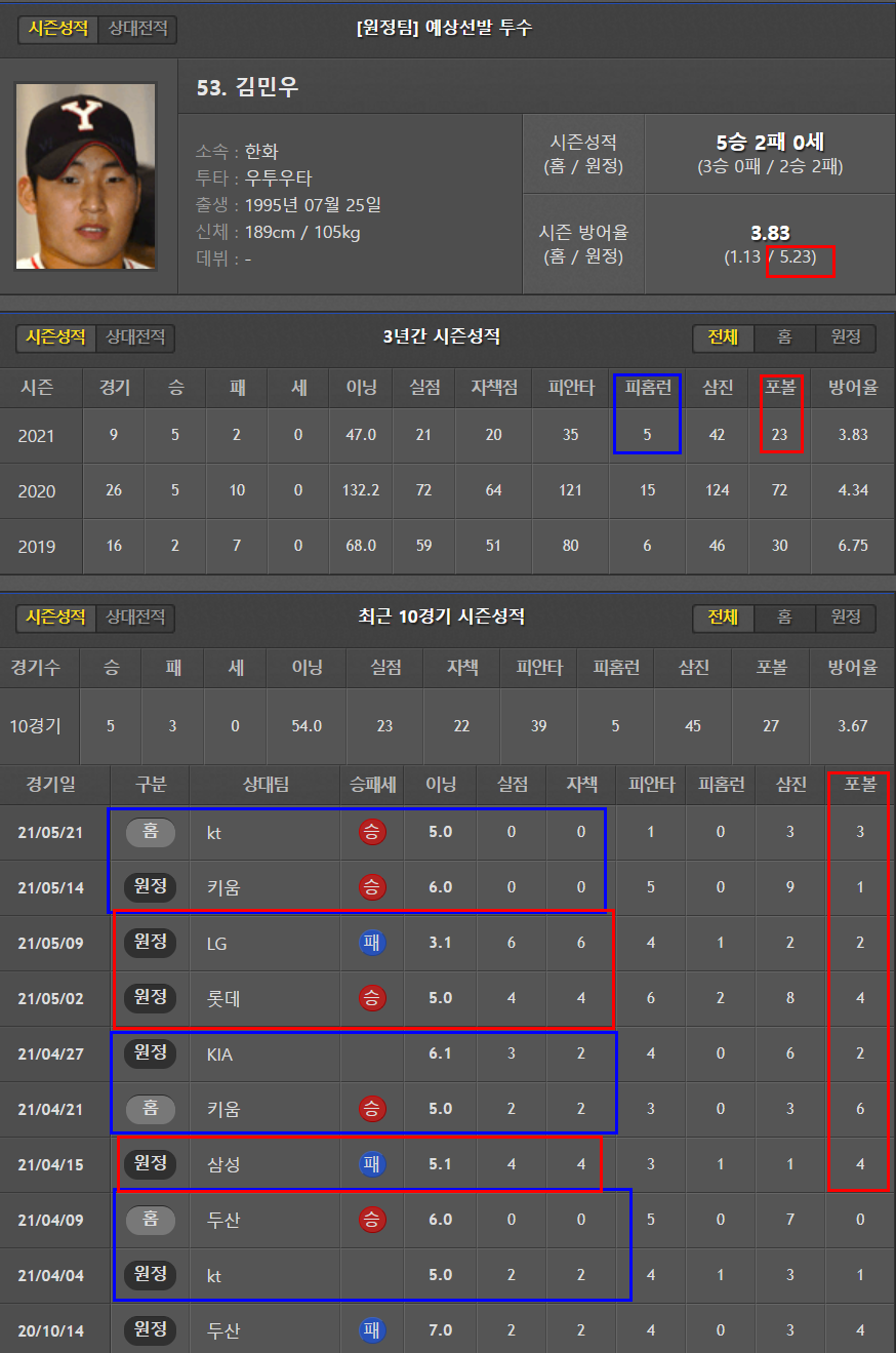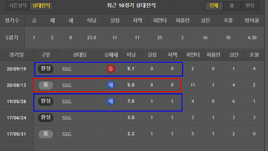홈 8.1평자로 유독 홈 성적이 좋지 못하다. 공이 좋은데 반해 무사사구 경기가 없는 만큼 볼넷을 줄이는게 관건이다.