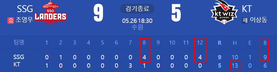 폰트 6이닝 1자책 / 고영표가 7이닝 1자책으로 멋진 투수전을 이끌었다. 언더로 갈것같았던 경기흐름은 급격하게 변했다. 경기가 터지기 시작한 것은 불펜이 올라오고 부터다. 7회 SSG 불펜이 박경수의 솔로포와 함께 3점을 더 헌납하면서 KT의 승리가 확정적이였으나, 바로 이어진 8회초 KT안영명, 김민수, 조현우, 김재윤이 줄줄이 볼넷을 연거푸 내주며 밀어내기 볼넷을 허용한뒤 한유섬에게 넘긴 바통을 싹쓸이 2루타로 주워담으며 역전에 성공했다. 역시 SSG 불펜 역시 이태양의 난조로 동점을 따라잡히며 연장 12회에 SSG가 4점을 쓸어담으며 승리로 매듭짓는다.