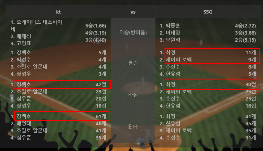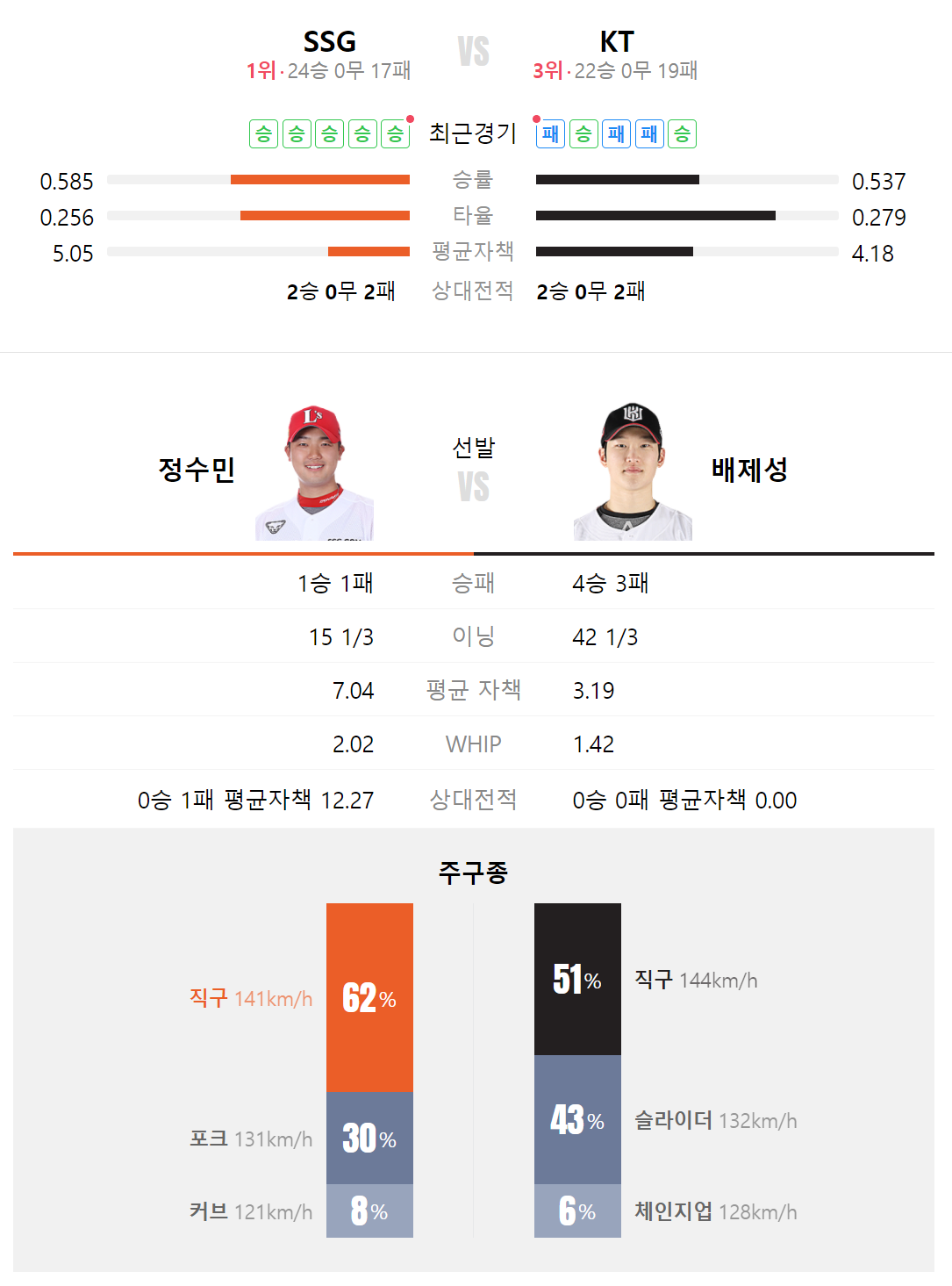 정수민보다는 역시 배제성의 호투가능성이 훨씬 높다. 강백호만 막으면 크게 위험부담이 줄어드는 KT타선인데, 어제 케이티는 고영표의 승리를 날리면서 연장12회까지가는 수모를 겪으며 역전패를 당했다. 정수민을 상대로 초반에 집중하지 못하면 또다시 반복될 가능성이 높다. 배제성은 최정, 추신수 등 ops형 타자들이 끊임없이 눈야구로 출루하는것을 막아야한다. 초구부터 과감하게 스트라이클 꽂아넣으며 볼넷을 어떻게든 최소화하면서 이닝을 길게 끌고가야한다. 어제 무너진 KT불펜이기에 오늘도 불펜의 역할을 최소화 시켜야한다. 관건은 '정수민'의 5이닝 소화여부다. 슥타선이 무섭기때문에 쉽게 배제성의 호투를 장담할수없기에 8.5기준 오버를 노려봄직하다. 여러변수가 있기때문에 베팅은 추천하지 않겠다.