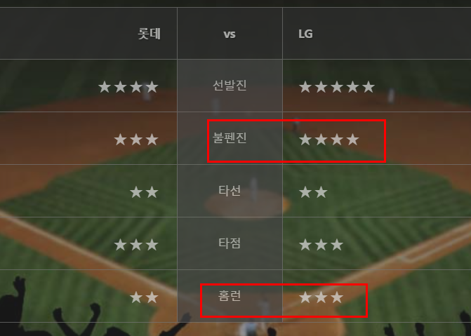 정찬헌과 프랑코의 대결. 정찬헌은 직전경기에서 대량실점하며 패전을 기록했는데, 이날 유일하게 우천으로 경기취소되지않고, 비맞아가며 경기를 치뤘다. 허리부상으로 관리받고있음을 감안하면 충분히 난조를 보일수있다. 프랑코 또한 확실한 안정감은 아직 부족한 상태다. 어수선한 롯데의 흐름을 잡아줄수있을까?