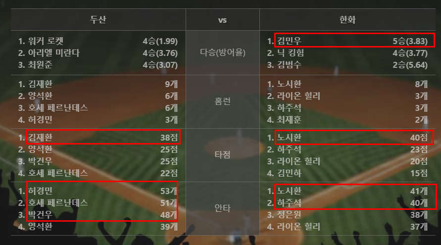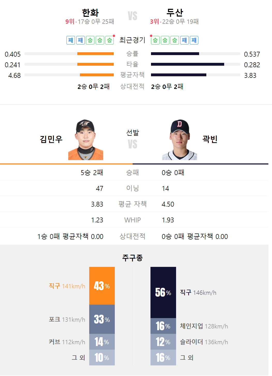 김민우와 곽빈의 대결. 김민우는 3경기 연속 에이스급 모드였던 배제성을 상대로 5이닝 1피안타 무실점으로 막으며 한화의 4:0 승리를 가져다주면서 2경기 연속 무실점피칭을 이어가고있다. 곽빈은 선발로테이션에 합류해서 선발수업을 받고있는데 아직까지는 딱 평범한 4~5선발급의 내용을 보여주고있다. 한단계 더 발전하기 위해서는 경기운영이나 결정구 등에서 조금씩 나아지는 발전되는 모습을 보여주어야 할 것이다.