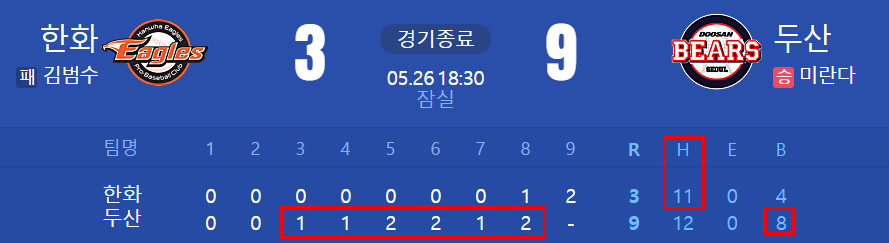 예상대로 타격전이였지만 다만, 한화만 득점없는 타격전이였을뿐.. 김범수로 예정됐던 선발이 바뀌어 장웅정으로 바뀌었다. 바뀌든 말든 어차피 결과는 상관없었다. 등판한 모든 한화투수들은 실점을 피할수없었다. 정은원은 예상대로 전타석 출루를 하며 미란다를 흔들었으나 미란다는 6이닝 무실점으로 한화를 농락했다.