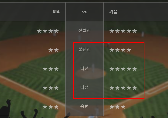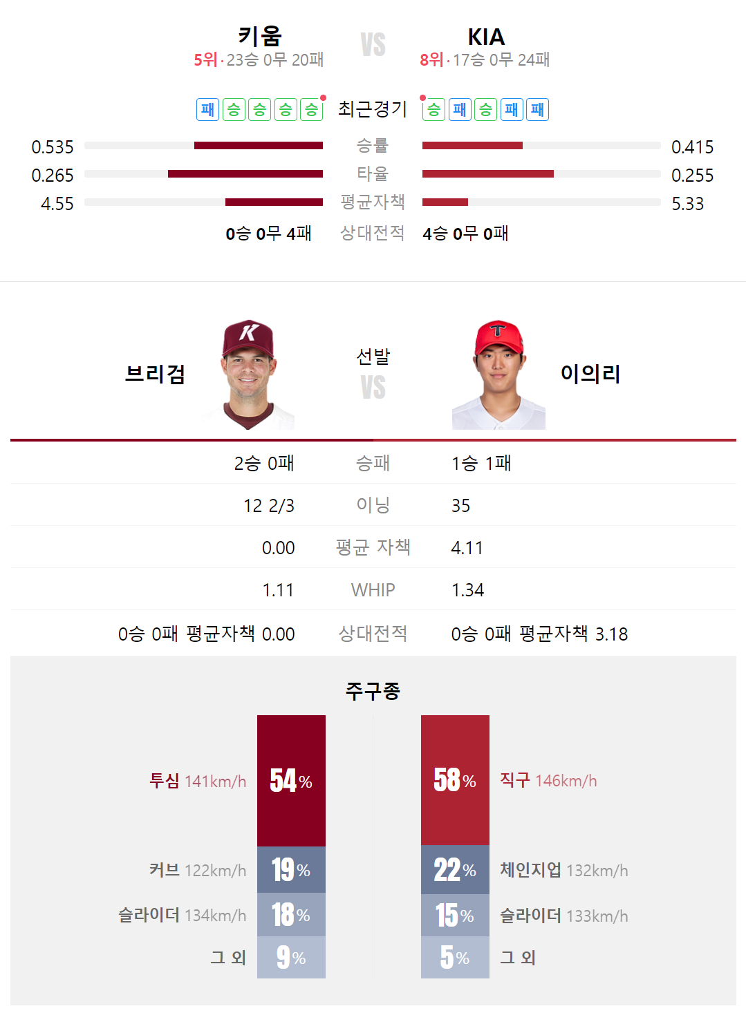 키움의 뜨거운 기세가 끝났을까? 기아 에이스 브룩스를 만난만큼 이의리를 상대로 다시한번 불씨를 지필수 있을 예정으로 보인다. 이의리는 볼넷갯수를 줄여야만한다. 하지만 키움타선은 꾸준히 출루할수있는 능력일 갖췄다. 반면 브리검은 복귀후 무실점 행진중인데 이번에 개편된 기아 타선에 좌타들이 많이 포진되있다. 그럼에도 불구하고 브리검이 우위를 갖추고 있으며 타선도 키움이 안정되있다고 볼수있다. 키움승에 핸승까지 노려볼수있는 경기가 될 전망이다.