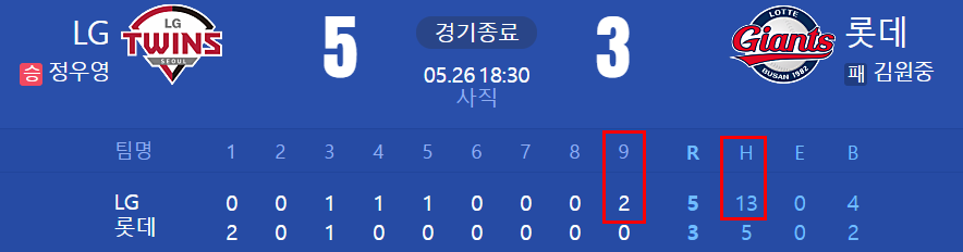 다소 애매했던 양팀 선발(이상영, 나균안) 모두 3실점씩 사이좋게 나눠가졌다. 경기는 9회 올라온 김원중이 유강남에게 2타점 적시타를 맞으면서 엘지가 승리를 가져갔다.