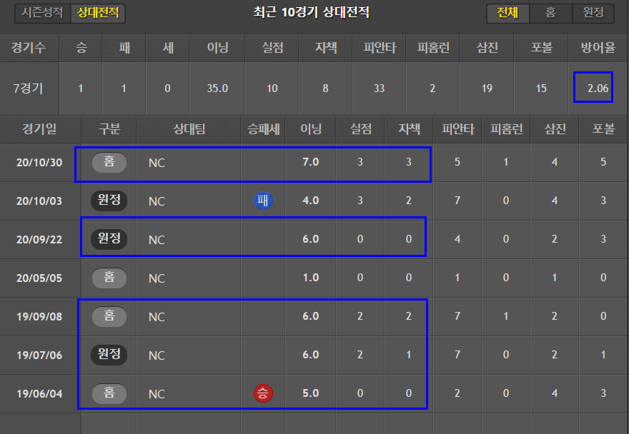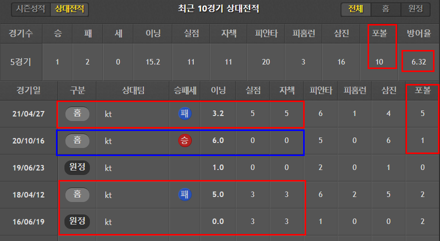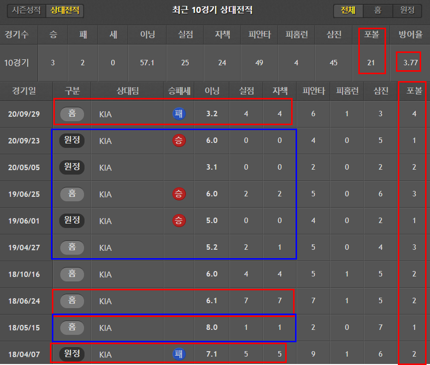 역대 기아와의 맞대결에선 평범한 성적을 남겼다.