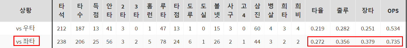 20시즌 좌타상대 타율/출루율/ops가 .272/.356/.735 좋지않다.