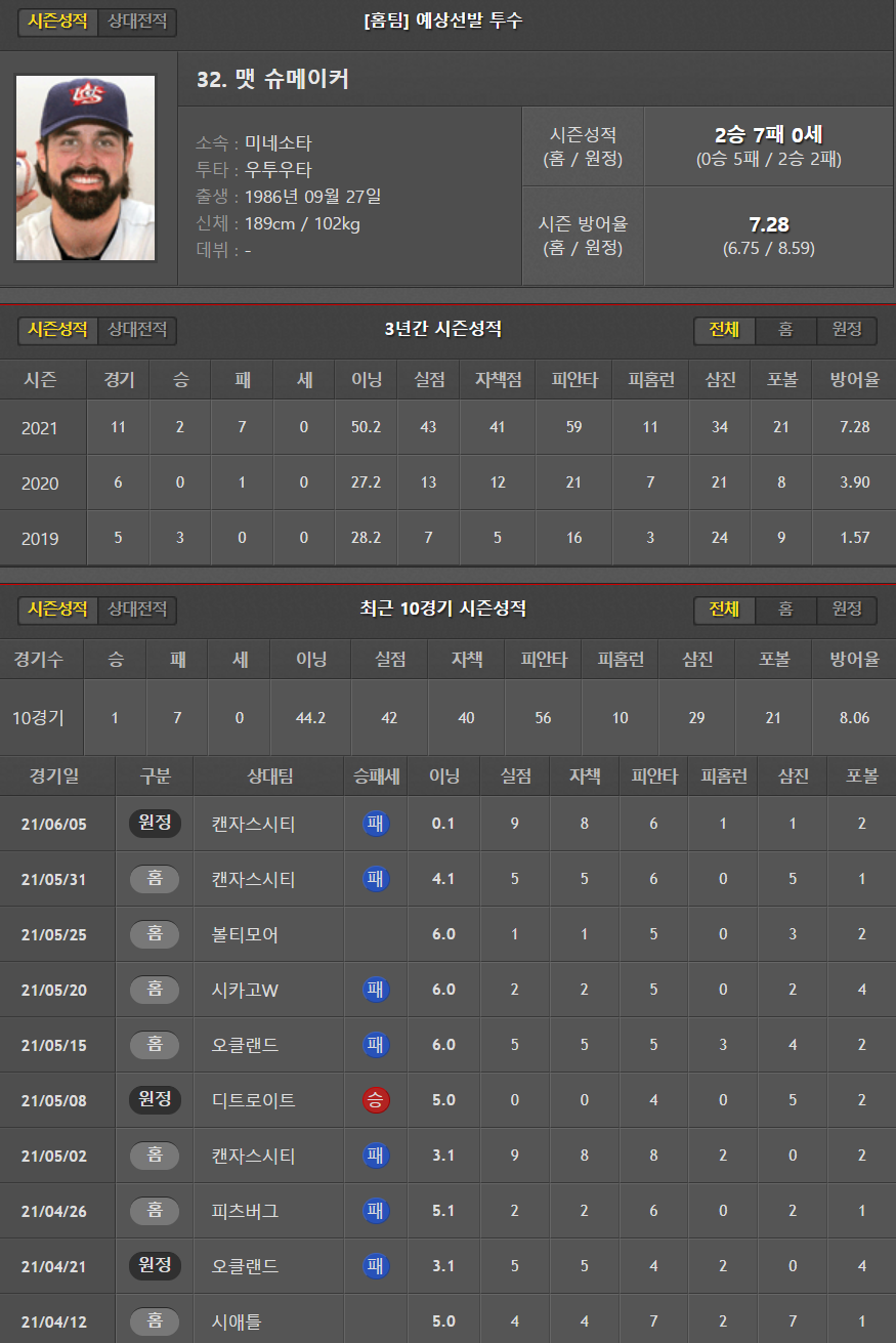 슈메이커 신발제작자. 직전 등판 거하게 말아잡쉈다ㅋㅋㅋ 최근 퀄스를 기대하기 애매한 피칭. 하지만 미네는 투수가 없다. 계속되는 패의 행진..