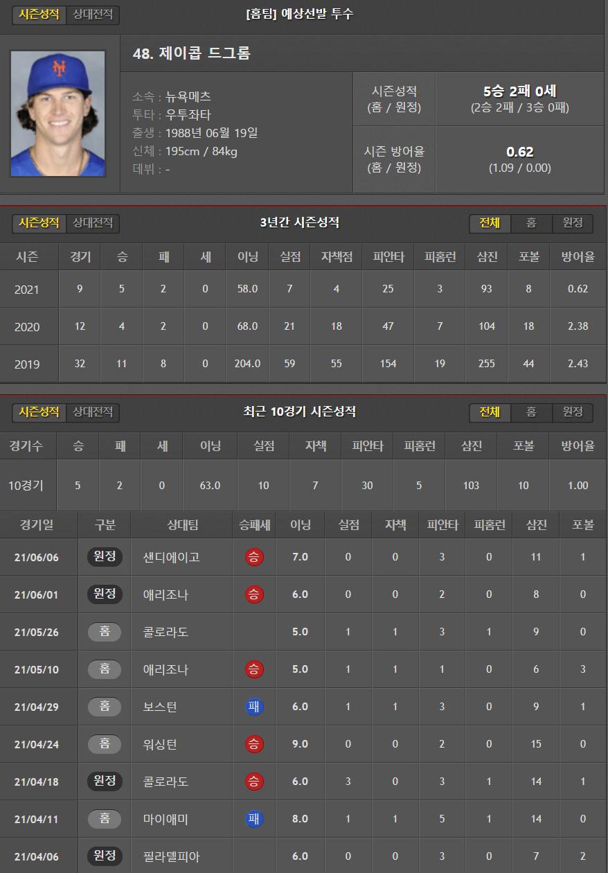 불과 2주사이에 샌디는 약팀이 되었고, 메츠는 강팀이 되었다. 그리고 모두가 기다리는 디그롬의 등판이다. 스넬은 정신못차리다가 직전경기 메츠전에서 7이닝 무실점으로 10삼진을 뽑아내면서 호투했다. 이번 경기 역시 호투한다면 지루한 투수전이 될 것이고, 또다시 흔들린다면 디그롬의 넉넉한 승리가 될 것이다. 어차피 메츠쪽으로 기울수밖에 없는 배당이다. 스넬이 비록 호투한다하더라도 고개숙인 샌디타선이 디그롬을 상대로 득점지원은 전혀 기대할수가없다. 지금 디그롬은 역사를 쓰고있다.