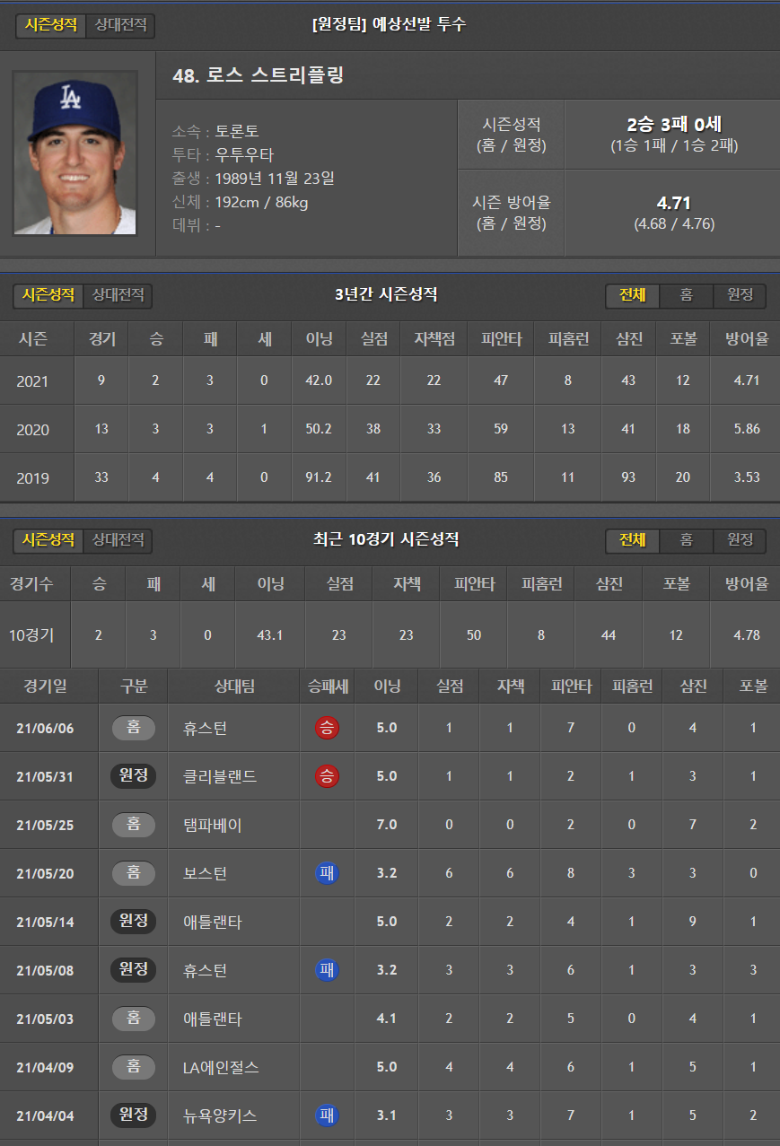 스트리플링 토론토로 와서 흔들렸지만 최근 3경기 호투하면서 승리투수가 되며 감아가는 찾는 모습이다.