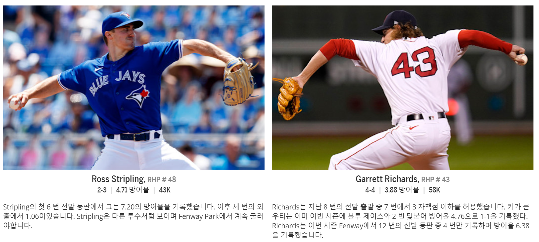 다소 주춤하고 있는 토론토 타선과 팀분위기. 보스턴은 다소 상승세지만 확실한 분위기는 아니다. 양팀 비슷한 선발이 맞붙었기에 승리를 장담하기 어려운 매칭이다. 스트리플링의 기세가 좋아보이지만 확신할수있을만한 정도는 아니다. 베팅은 하지않는게 좋아보인다. 그냥 경기를 즐겨라. 토론토 역배승 1.97배