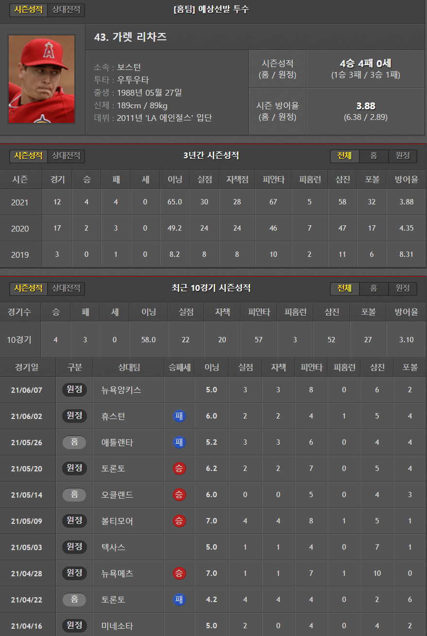 개럿 리차드는 크게 무너지지 않으면서 이닝을 꾸준히 소화해주고있다. 원정에서 2.89로 홈 6.38 큰 차이를 보이고 있어 이번 홈경기에서 걱정이 되는것은 사실이나 홈경기가 적었기때문에..