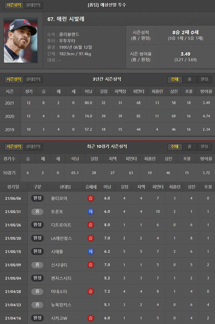승운이 따라주는 투수 애런 시베일. 벌써 8승? 6이닝 이상 소화해주면서 비록 무실점경기는 없지만 클리블랜드의 선발로 당당히 자리잡고 있다.