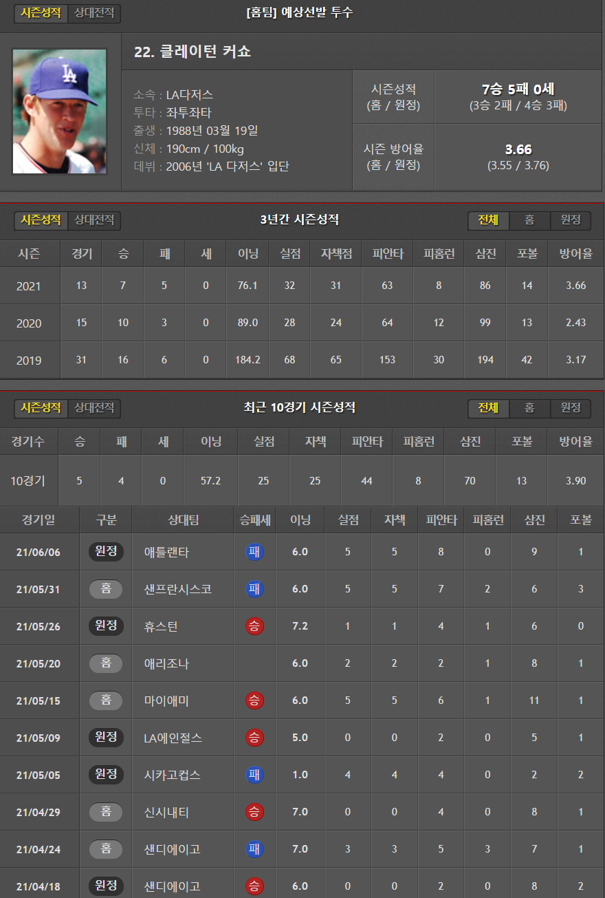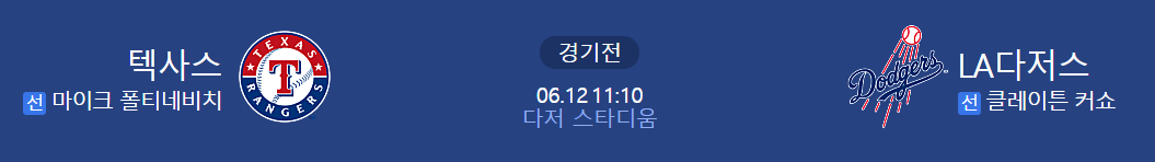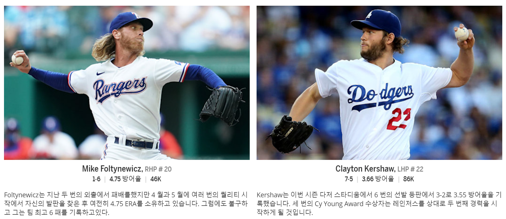 커쇼는 최근 2경기 등판을 망치면서 평자가 3점중반으로 상승했다. 텍사스전은 6년만의 대결이다. 6이닝이상 꾸준히 소화하는것이 그나마 위안거리지만 실점을 줄여야 할 것이다.