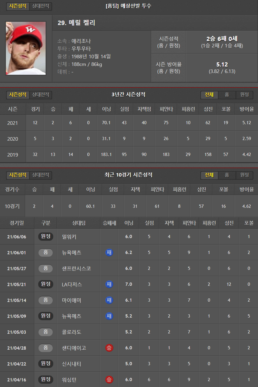 너무 잘알고있는 메릴켈리. 이닝소화능력은 좋지만 실점을 억제하는것이 먼저다. 홈 3.82로 비교적 안정된 피칭을 했기에 이번 등판에서 홈강세를 이어갈수있을까?