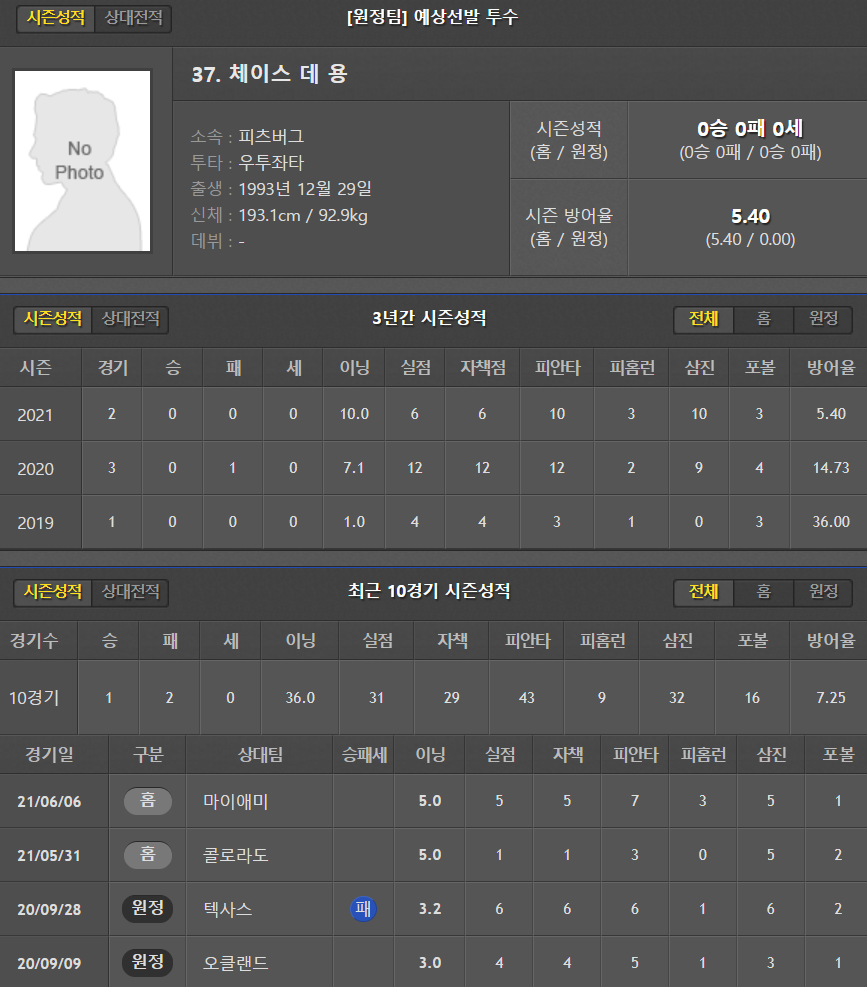 체이스 데용. 5이닝을 던질수있다는 것에 감사해야하는 피츠버그.