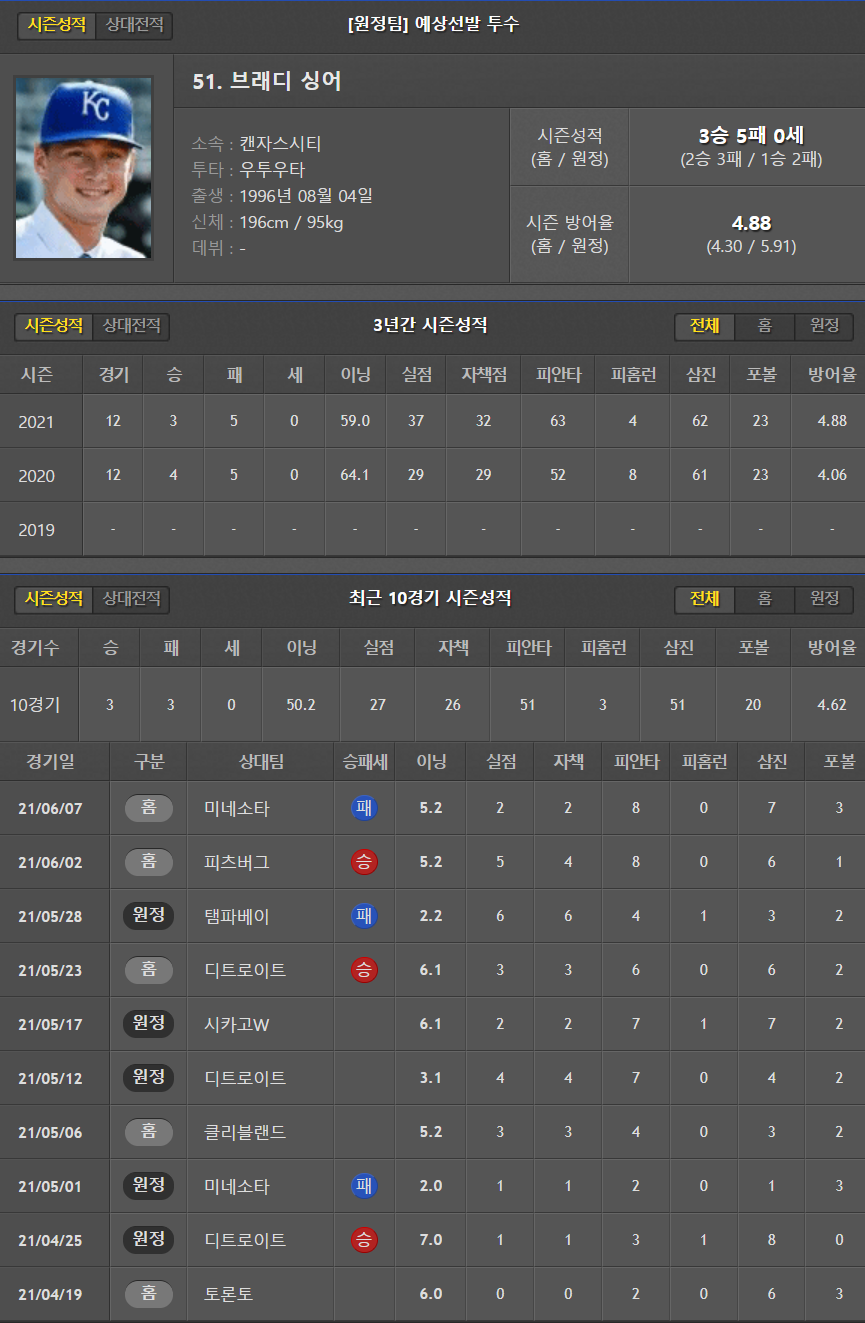 브래디 싱어는 역시 콜어빈과 마찬가지로 안정감을 주기엔 조금 부족한 모습이다. 호투하는 모습도 보여주지만 최근 난조세를 이어가면서 불안한 모양새를 노출하고 있다.