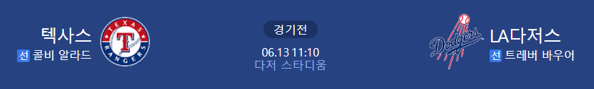 바우어는 최근 파인타르 규제에서 스스로 벗어나며 성적이 하향되는 기록을 보이고있다. 6~7이닝 무실점을 기대했던 투구에서는 이제는 6이닝 3실점의 다소 평범한 퀄리티스타트급 피쳐가 되어가고있다. 한편 콜비 알라드는 이제 갓 29이닝을 소화한 선발수업중인 투수인데 아직 5이닝을 소화하기도 버겁다. 양팀의 행보도 아시다시피 극명하다. 최근 10경기 팀타율 .186인 텍사스는 여지없이 승리기회를 만들기 어려워보인다. 이변없이 다저스의 승리가 예상된다.