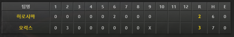 오릭스가 2회에 낸 3점으로 마지막까지 승리를 지켰다. 오릭스 선발 타지마는 5이닝 무실점으로 버티며 승리를 챙겼고, 뒤이어 등판한 료타가 1아웃도 잡지못하고 3볼넷 1피안타를 내주며 2실점했지만, 나머지 투수들이 1점차 위기를 잘 처리하며 살얼음판 리드속에서 경기를 지켜냈다. 히로시마 마사토는 6이닝 3실점으로 퀄리티스타트피칭에 성공했지만, 일본에서 퀄스는 승리를 보장받을수없다는 사실을 다시한번 입증하며 패전을 기록했다.