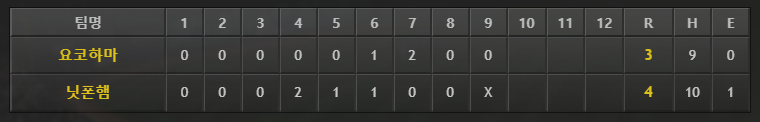 상승세였던 요코하마가 다소 불안했던 교야먀를 선발로내면서 역시나 4이닝 3실점 패전을 기록했다. 반면 닛폰햄은 계속 호투하고있는 이케다를 선발로 내세워 5.2이닝 1자책으로 뜨거웠던 요코하마 타선을 막으면서 한숨돌리게 되었다. 뒤늦게 추격을 했지만 아쉬운 1점차 패배였다.