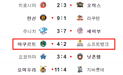 니혼햄의 드류 베르하겐과 요코하마 이마나가 쇼타의 대결. 니혼햄을 보자니 참 마음이 아프다. 최악의 피칭을 선보이고 있는 외국인 투수를 쓸수밖에 없는 팀 사정이 있는 것일까? 니혼햄 베르하겐은 최근 무실점은 커녕 퀄스는 기대조차 할수없는 실망스러운 투구내용을 선보이고 있으며, 5이닝을 채우는것조차 미션인 상황이다. 직전경기 6이닝 4실점으로 잘버티긴했지만 여전히 의문인 투구내용이다. 한편 요코하마 이마나가는 다소 주춤했지만 다시 페이스를 회복하고 2경기 연속 6이닝 1실점급의 호투를 이어가고있다. 최근 팀타율 3할까지 끌어올린 타선까지 폭발하고 있어, 두말할것도 없이 투타에서 모두 우위를 갖춘 요코하마의 승리를 쉽게 예상할수있는 경기다.