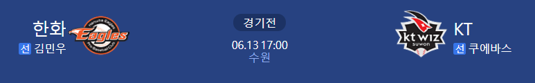 시즌 초 망나니같은 피칭을 지나 점차 안정을 찾고있는 쿠에바스지만 여전히 퀄리티스타트피칭을 기대하기엔 아직은 다소 무리가 있어보인다. 오늘의 미션은 6이닝을 소화. 한편 김민우는 최근 뜨거운 기세로 승리를 주워담으며 7승3패를 기록하고 있다. KT의 타격감은 물이 올랐다. .292의 10경기 팀타율과 꾸준히 볼넷과 함께 출루해주면서 홈런을 곁들이며 득점루트를 다양하게 개척하고 있다. 한편 한화는 최근 5경기 매우 저조한 득점을 올리면서 부진에 늪에 빠졌지만, 꾸준히 볼넷을 얻으면서 출루의 끈을 놓지고 있지 않다. 문제는 잔루다. 득점권상황에서 진루타나 희생플라이를 치지못하고 병살타와 삼진같이 맥이 자꾸 끊기면서 전형적인 약팀의 모습을 보여주고 있다. 오늘은 다소 폼이 떨어진 쿠에바스를 상대로 대량득점을 이어갈 확률이 커보인다. KT타선이 최근 뜨겁긴 하지만 최근 김민우는 강팀 약팀 가리지 않고 자신의 공을 던졌을때 꾸준히 제 페이스로 호투하고있는 모습이며, 최근 KT전에서도 5이닝 무실점을 만들어냈다. 한화의 필승조또한 강재민이 선봉에서 막강한 위력을 자랑하고 있기때문에 한화의 승리가능성이 커보이는 경기다.