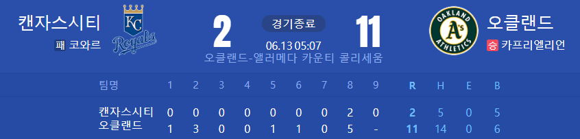 오클타선이 살아나면 정말 강하다. 역시나 선발과 타선에서 우위에 있던 오클랜드가 시작부터 끝까지 확인사살한 경기다. 캔자스 선발 코와르는 지난 등판에 이어 이번등판도 매우빠른 굴비강판을 당하며 앞으로 선발기회를 받을수있을지 불투명하다.