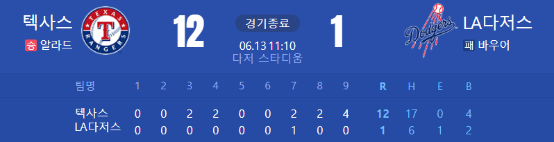 개빡치는 경기. 바우어가 정말 파인타르 효과를 증명하기위해 안쓰면 병신된다는 사실을 입증하는 경기였던 것인가? 아니면 커버스픽인가? 최악의 타선 침체를 보이던 텍사스와 절정의 기세를 보이던 두팀은 완전히 뒤바뀐 결과를 낳았다? 세상에나 이게 ㄹㅇ가능한 일이야?! 다저스는 4연승이 끊겼고, 텍사스는 갑자기 17안타를 퍼부으며 급발진했다.