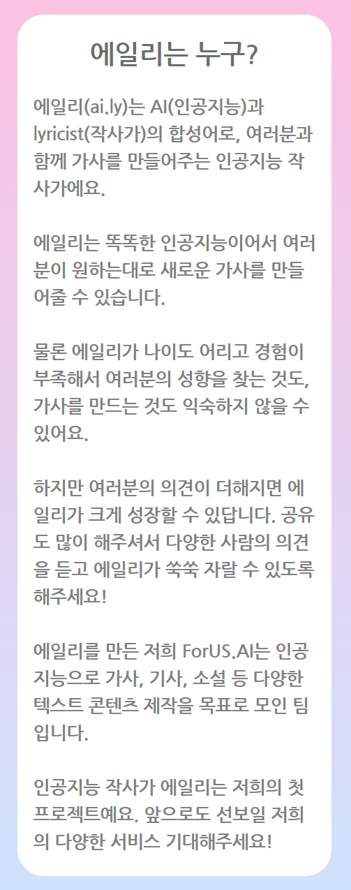 에일리(ai.ly)는 AI(인공지능)과 lyricist(작사가)의 합성어로,