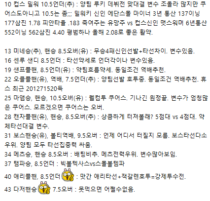 10. 컵스 밀워 10.5언더(추) : 양팀 루키 데뷔전 맞대결 변수 조올라 많지만 쿠어스도아니고 10.5는 좀;;; 밀워키 신인 에단스몰 마이너 3년 통산 137이닝 177삼진 1.78 피안타율 .183 죽여주는 유망주 vs 컵스신인 맷스워머 6년통산 552이닝 562삼진 4.40 평범하나 올해 2.08로 좋은 활약.