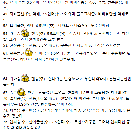 70. 엘지승(유), 핸승, 9.5오버(유) : 선발4연패 이인복+롯데 6연패 vs 5이닝도 못채우는 LG신인선발. 변수있음. 역배조심.