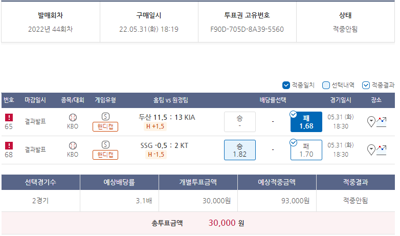 | 220531 승부식44회차 야구토토 (3) | 2022.05.30 |