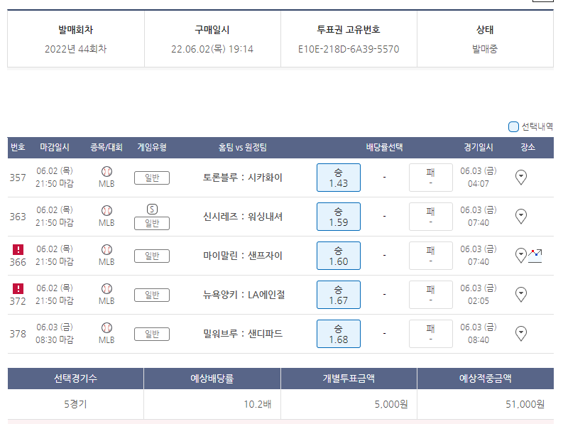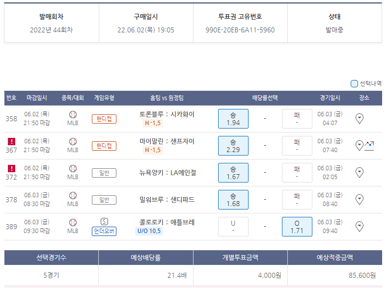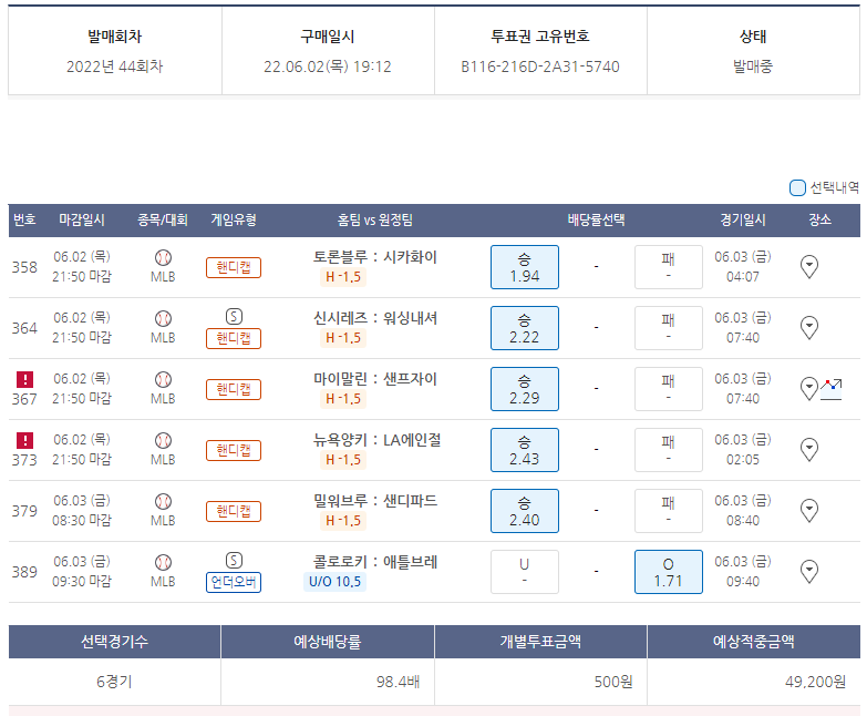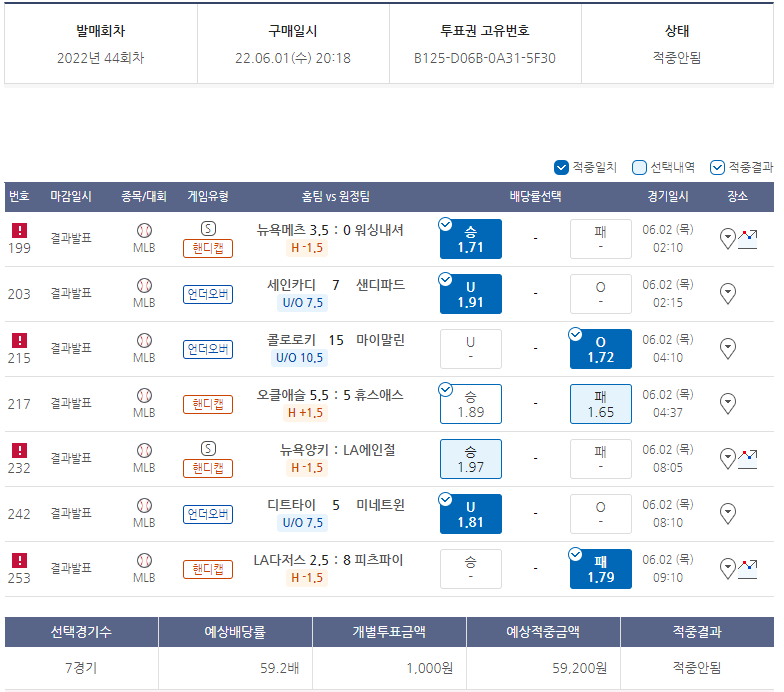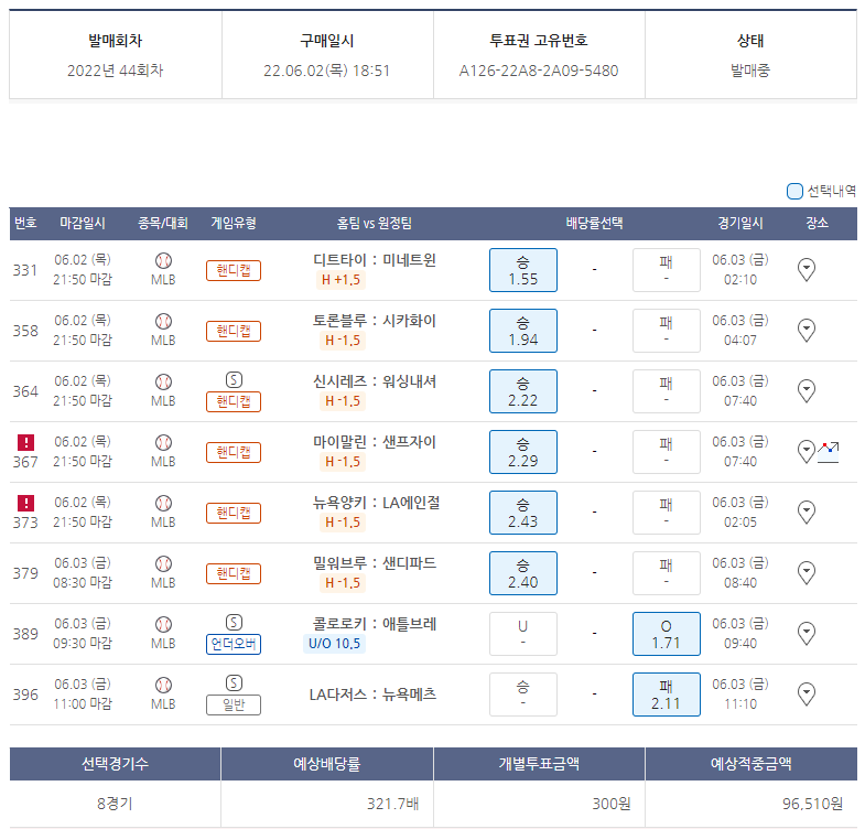 | 220601 승부식44회차 MLB (8) | 2022.06.01 |