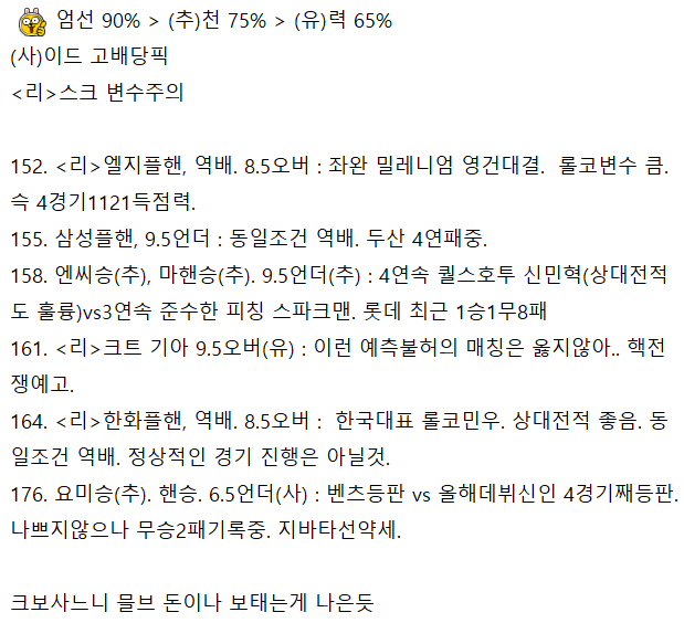 152. <리>엘지플핸, 역배. 8.5오버 : 좌완 밀레니엄 영건대결. 롤코변수 큼. 슥 4경기1121득점력.