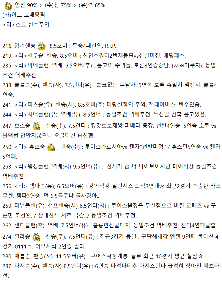 244. <리>시애플핸(유), 역배(유). 8.5언더 : 동일조건 역배추천. 두선발 간혹 롤코있음.