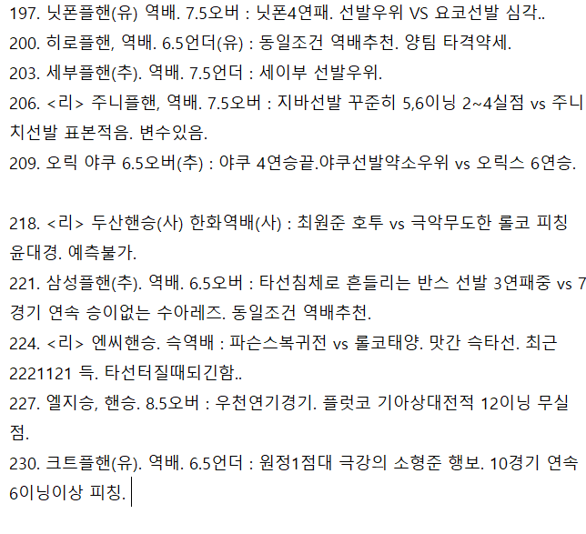 221. 삼성플핸(추). 역배. 6.5오버 : 타선침체로 흔들리는 반스 선발 3연패중 vs 7경기 연속 승이없는 수아레즈. 동일조건 역배추천.